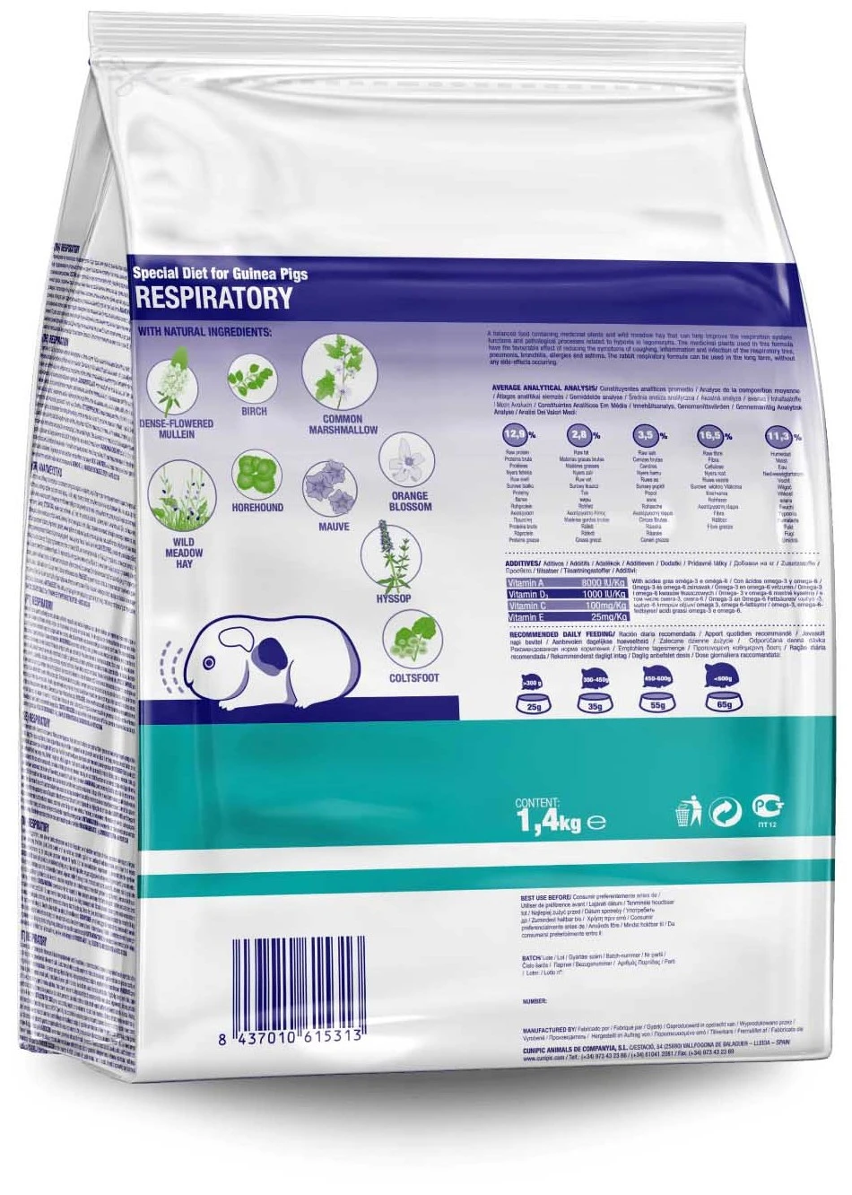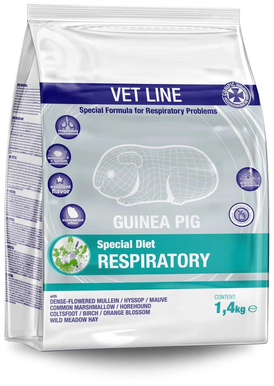Aliment complet formulé avec des plantes médicinales et du foin de première qualité avec une grande capacité à améliorer les fonctions du système respiratoire des animaux. Ils influencent favorablement la réduction des symptômes de la toux, l’inflammation et l’infection de l’arbre respiratoire, la pneumonie, la bronchite, l’allergie et l’asthme. La formule respiratoire de cobayes peut être administrée à long terme sans effets secondaires indésirables.