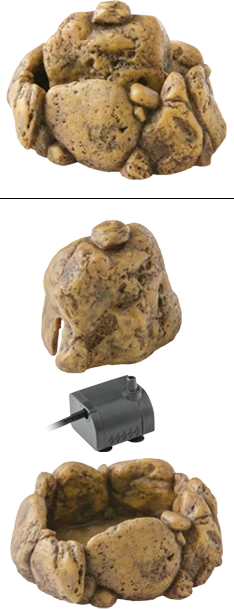 L’abreuvoir Exo Terra pour reptiles est un bol d’eau incomparable qui fournit une source d’eau fraîche, propre et aérée à vos reptiles et à vos amphibiens. Beaucoup de reptiles ne savent pas reconnaître une source d’eau si celle-ci est stagnante. Grâce au mouvement d’eau constant de cet abreuvoir, qui coule du haut de la roche vers le fond du bol, les reptiles sont portés à boire davantage, ce qui les garde hydratés et en santé. Ce débit d’eau continu permet également d’augmenter le niveau d’humidité à l’intérieur du terrarium. Comme l’abreuvoir Exo Terra est stable et compact, il est facile à installer et les reptiles ne peuvent le renverser facilement. Il est également facile à nettoyer, car il n’est composé que de deux pièces, qui se séparent facilement aux fins de nettoyage. De plus, l’abreuvoir comprend une pompe Repti Flo Exo Terra qui produit la circulation d’eau. Par ailleurs, si vous avez des espèces de petite taille, il est préférable de mettre de petits galets ou du gravier dans le terrarium comme mesure de sécurité. De plus, traitez l’eau du robinet avec Aquatize pour enlever le chlore et les métaux lourds qu’elle contient. L’ajout de Biotize permet de garder l’eau limpide sur une longue période, en plus de contribuer à la prolifération de bactéries bénéfiques nécessaires et de réduire les odeurs causées par les déchets en décomposition.-Procure une source d’eau fraîche et propre continue-Encourage les reptiles à boire-Augmente le taux d’humidité-Design compact et stable-Facile à installer et à nettoyer-Pompe incluse