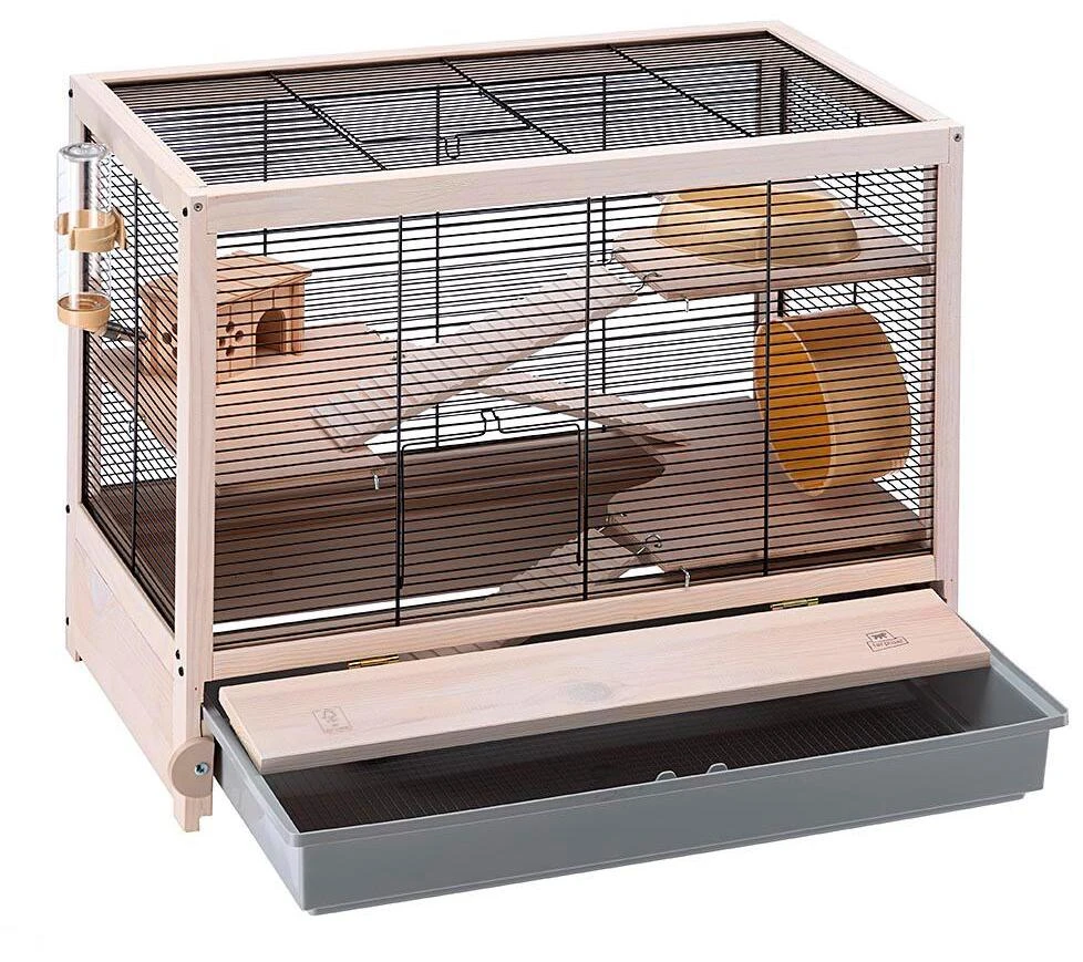 Confortable et pratique, cet habitat pour petits rongeurs convient également aux souris. Il présente un grand design, notamment grâce à sa structure à plusieurs niveaux. En effet, grâce aux différentes étagères et aux planchers intérieurs, votre petit compagnon aura la possibilité de faire de l’exercice et de rester en très bonne forme ; les escaliers en bois inclus relient les différents secteurs de la cage, permettant un accès facile à votre animal. Les étagères en bois sont traitées avec un vernis spécial qui les rend résistantes aux liquides et donc faciles à nettoyer.