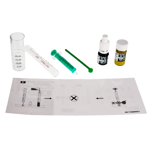 Livraison : 1 test de potassium pour environ 25 mesures, comprenant 2 réactifs, une cuvette en verre spéciale, une seringue, une cuillère à mesurer et une échelle de couleurs. Réactif de remplissage vendu séparément