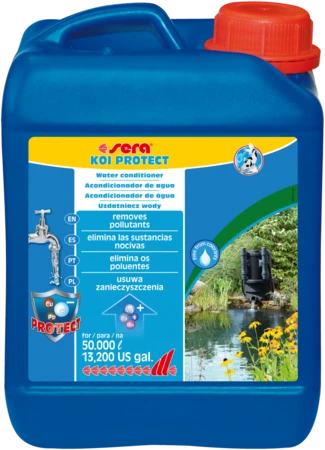 sera KOI PROTECT conditionne instantanément tous les types d’eau pour en faire une eau de bassin, limpide, saine et propre, adaptée aux poissons.